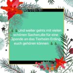 Unser besonders herzlicher Dank geht an Sandra Schönecker, die sich diese weihnachtliche Hilfsaktion ausgedacht hat, um unser Tierheim zu unterstützen. Alle wunderschönen Weihnachtsdekos hat sie in ihrem Urlaub selbst gebastelt. Die winterlichen Dekorationen sind entweder