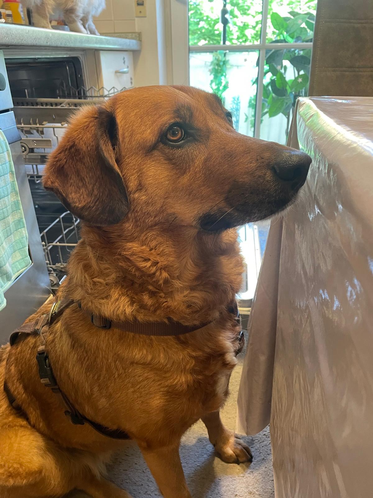 Unsere Mischlingshündin Lola kam zu uns, weil sich ihre Vorbesitzer getrennt haben und im Zuge dessen umgezogen sind. Sie wurde am 15.03.2021 geboren und bringt derzeit 39,2 kg auf die Waage, bei einer Schulterhöhe von 60 cm.