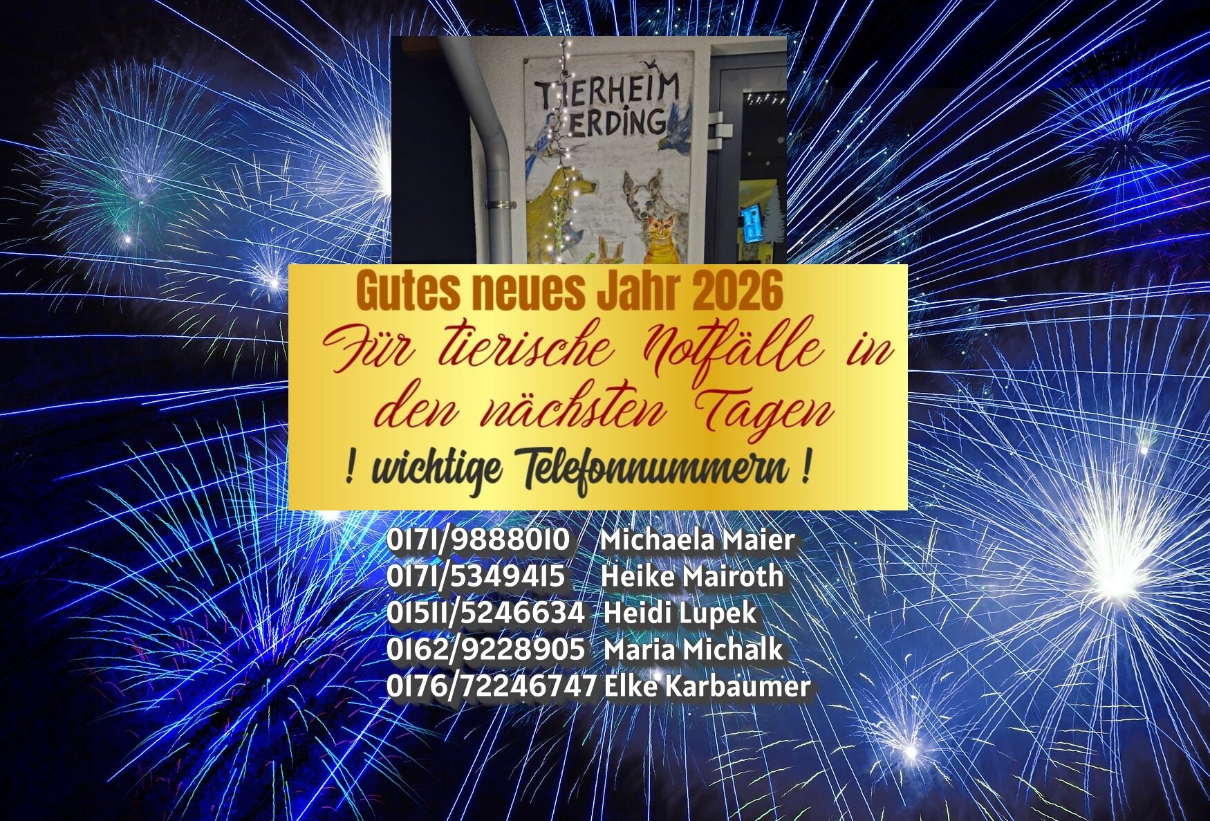 Hunde und Katzen bitte drin lassen…sie haben auch 2 Tage vor …an und einen Tag nach Silvester draußen alleine nichts zu suchen.
