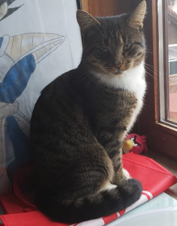 Farbe: Getigert schwarz grau mit weißen Pfötchen und weißem Fleck am Hals