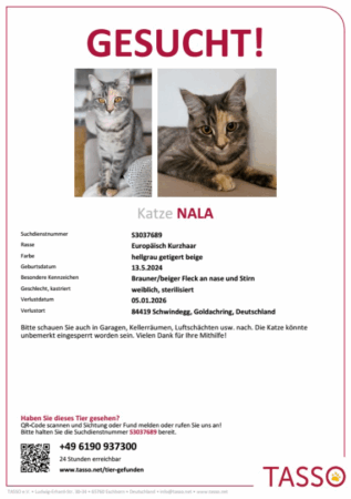 Wenn Sie Nala gesehen haben oder wissen, wo sie sich aufhält, melden Sie sich bitte unter 06190/937300.