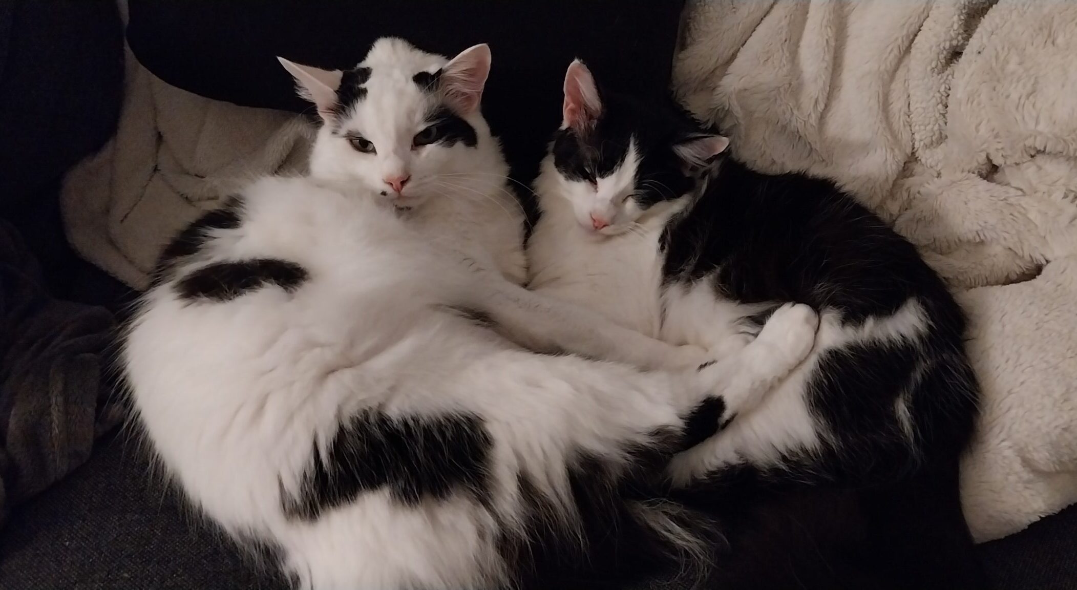 Mittlerweile sind beide verschmuste, verspielte und einfach liebenswerte Miezen geworden. Sogar Mogli, der leider damals ein Auge verloren hat und wirklich ein Mini-Kater im Vergleich zu seinem Bruder war, ist gewachsen und hat so schön zugenommen. Seine Einschränkung beim Sehen stört ihn überhaupt nicht – und er spielt am liebsten mit seinen geliebten Knisterbällen.