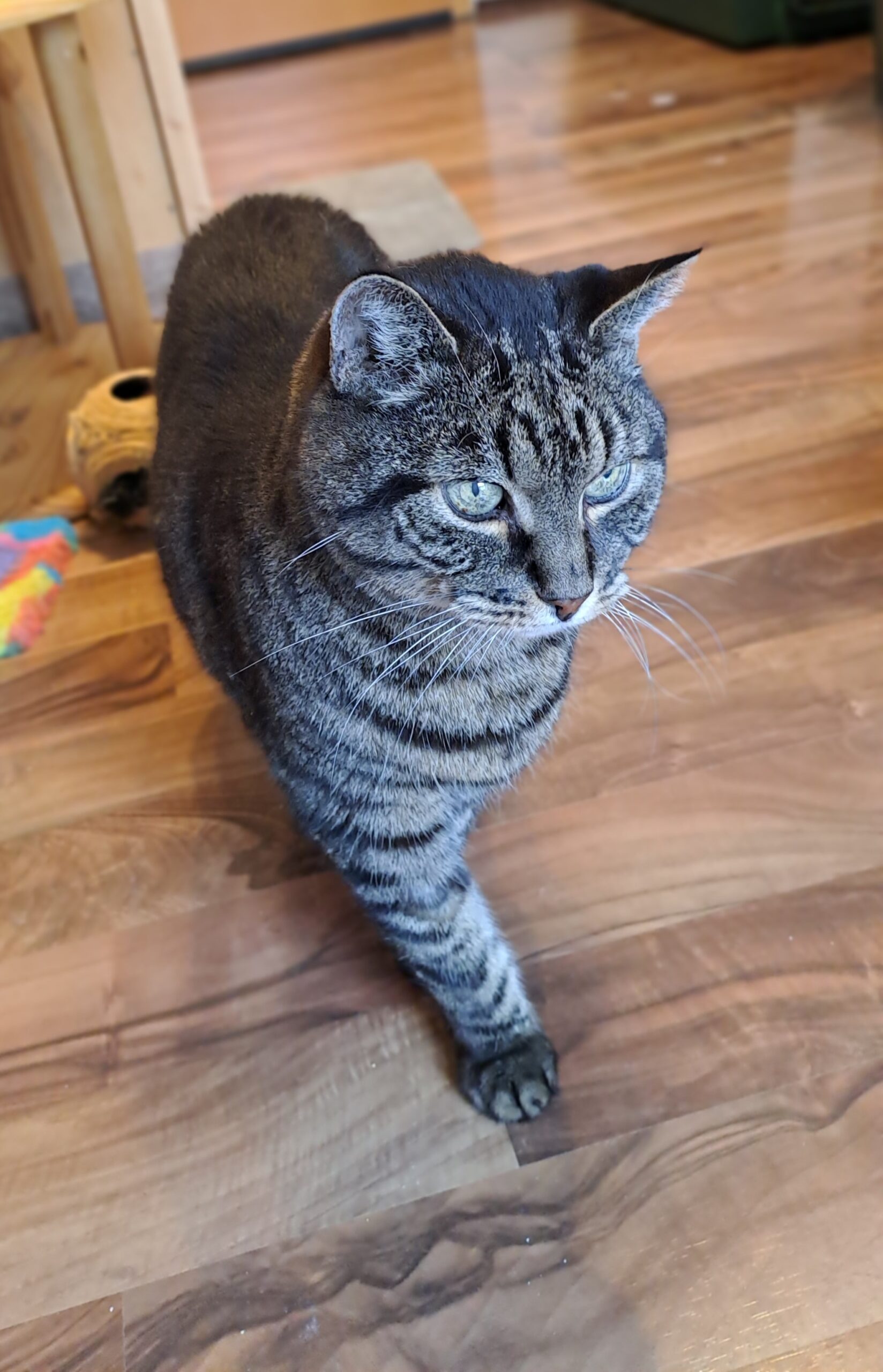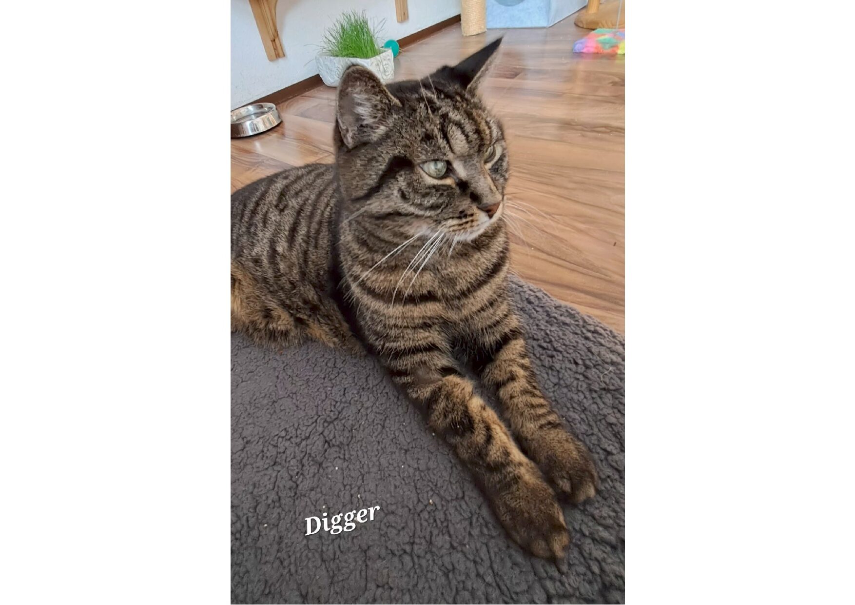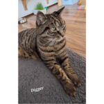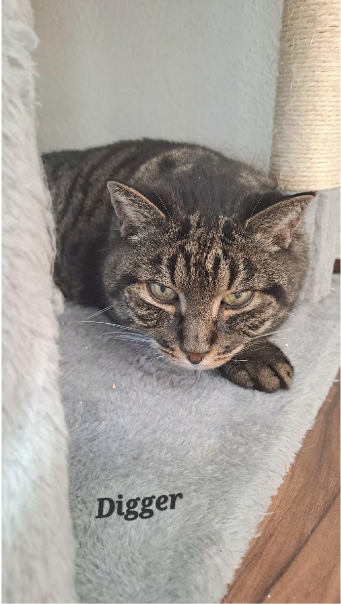Digger, getigert, 16 Jahre, Diabetiker. Kann leider kein Freigänger sein. Eine Wohnung mit gesichertem Freigang würde ihn sehr glücklich machen. Digger ist sehr anhänglich, schnurrt ebenfalls viel und liebt regelmäßige Streicheleinheiten. Digger ist der ruhigere von beiden.