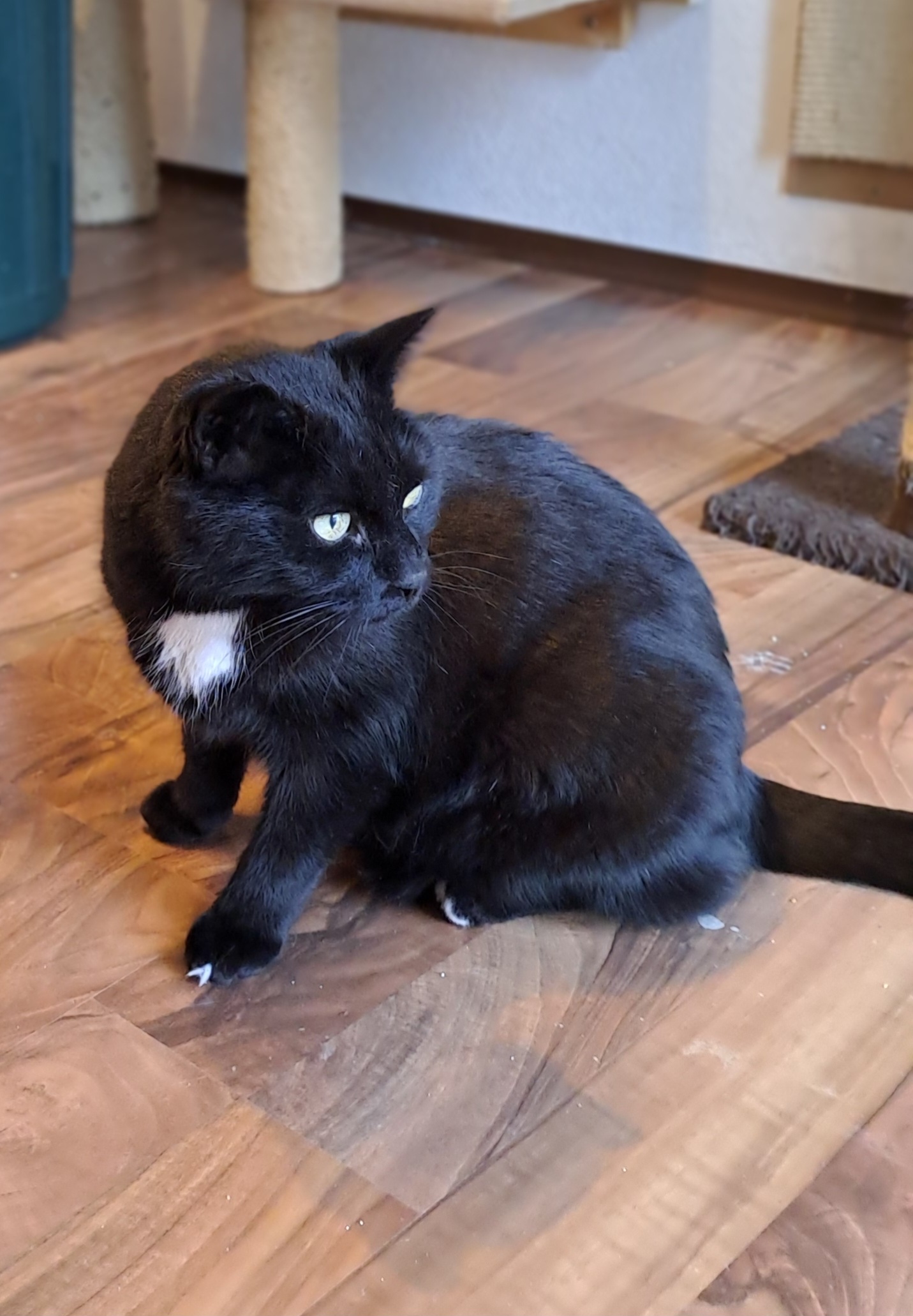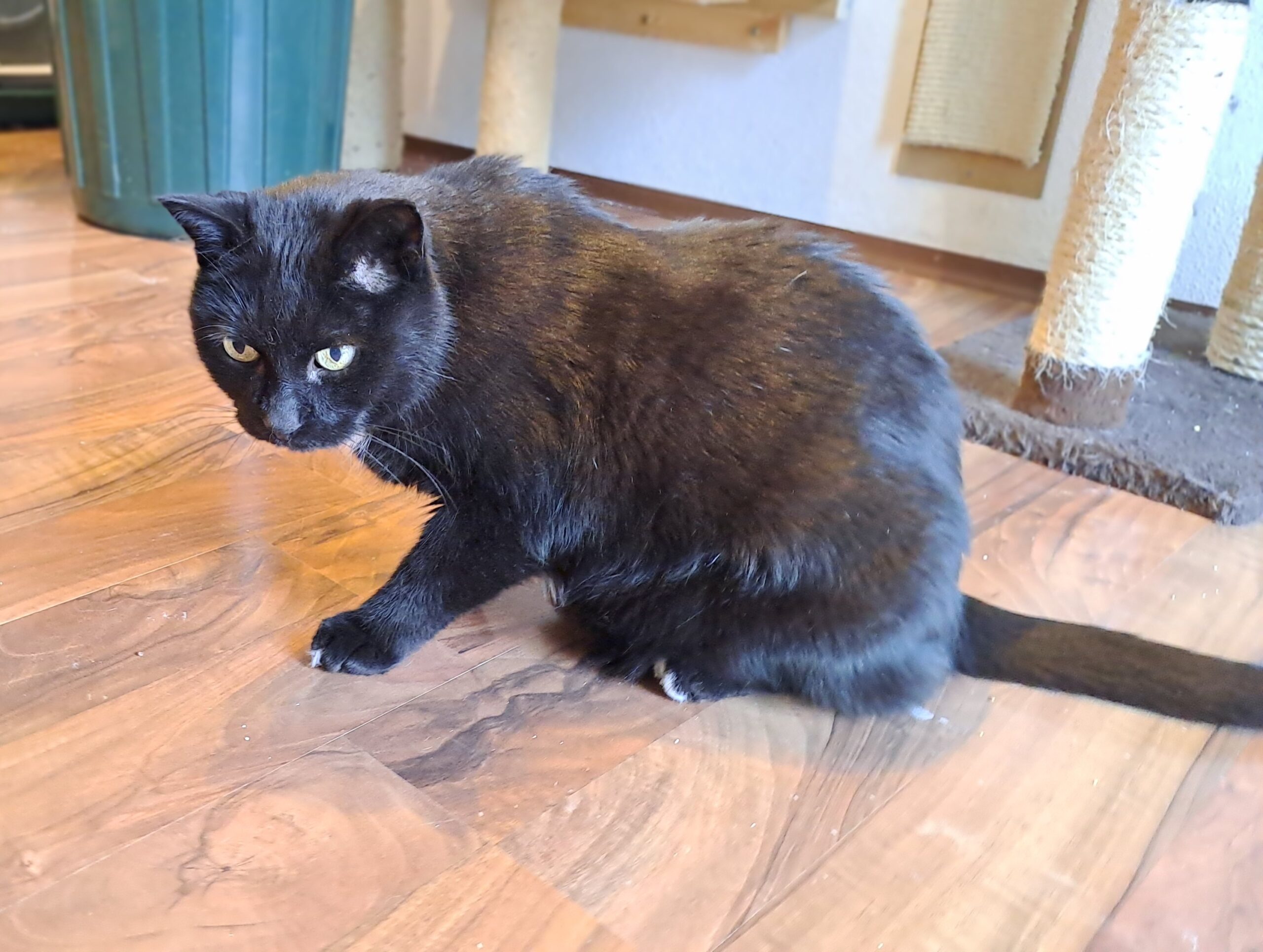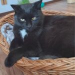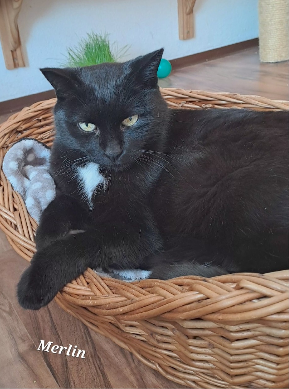 Merlin, schwarz, 15,5 Jahre, benötigt Schilddrüsentabletten. Er hätte gerne eine große Wohnung mit Freigang/ gesichertem Freigang. Merlin redet sehr gerne, schnurrt viel und genießt unheimlich seine Streicheleinheiten.