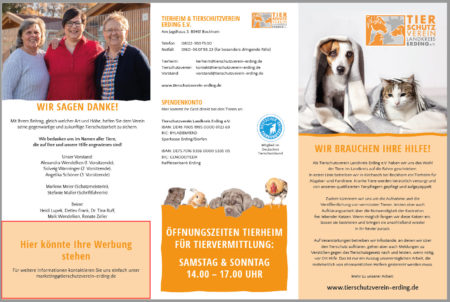 Wenn Sie auf unserem Flyer erscheinen möchten, dann schreiben Sie uns eine E-Mail an: marketing@tierschutzverein-erding.de.